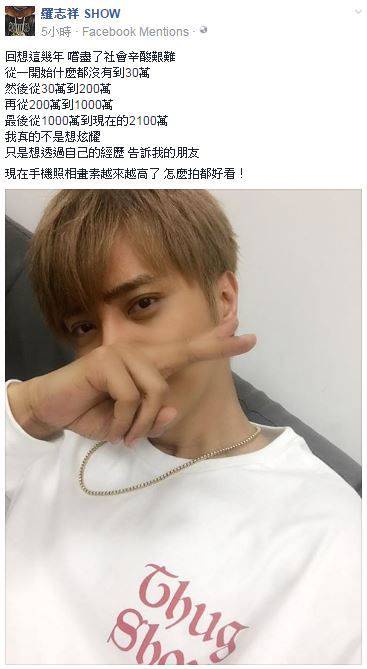 藝人羅志祥不僅跳舞厲害,也時常搞笑逗樂粉絲。今日突然感性地PO出一篇貼文,感嘆「從一開始什麼都沒有到30萬,然後從30萬到200萬,再從200萬到1000萬,最後從1000萬到現在的2100萬。」似乎想把在演藝圈23年打滾的辛酸血淚史分享給大家知道,就在不少網友疑惑羅志祥談的是什麼事情,他最後一句突然蹦出「現在手機照相像素愈來愈高了,怎麼拍都好看!」才讓粉絲恍然大悟被耍啦!