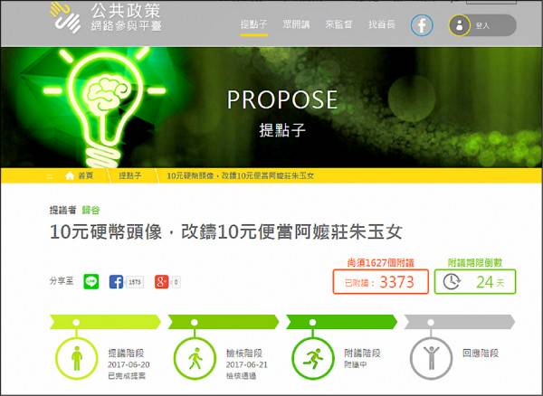 〔記者洪瑞琴、盧冠誠/綜合報導〕「公共政策網路參與平台」有民眾提案「10元硬幣頭像,改鑄10元便當阿嬤莊朱玉女」,原提案已一個月餘,至27日僅有28個附議,經本報獨家揭露後,一夕間暴增百倍,目前已衝破3千大關,且持續增加中。