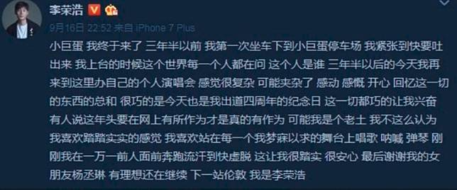 ▼李榮浩在微博上感謝楊丞琳(圖/李榮浩微博)