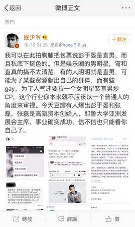 八卦帳號「圈少爺」半夜突然爆料,彭于晏和大陸知名基金投資公司「高瓴資本」的創辦人張磊有親密關係,並貼出多張對話,指出彭于晏和張磊有性關係。「圈少爺」還透露,雖然彭于晏是直男,「可能為了某些資源獻出自己的身體」。