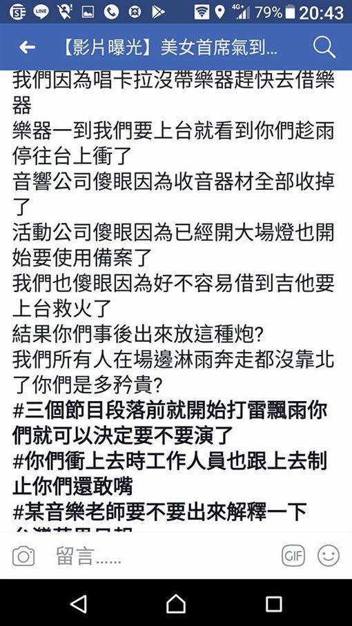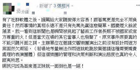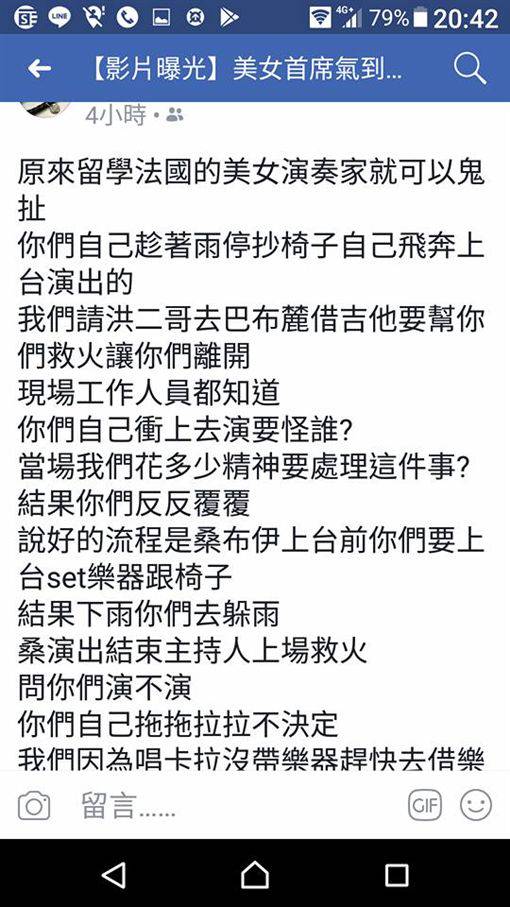 從她貼出的截圖看來,當天在場的工作人員還原了整起事發經過,「原來留學法國的美女演奏家就可以鬼扯!你們自己趁著雨停抄椅子飛奔上台演出要怪誰?說好的流程結果下雨你們去躲雨,主持人上台救火,問你們演不演,自己拖拖拉拉不決定」,卻在工作人員準備好備案、收掉收音器材後全部衝上台,「結果你們事後出來放這種炮,我們所有在場邊淋雨奔走都沒靠北了,你們是多矜貴?」