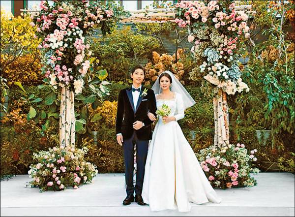 南韓明星宋仲基(左)、宋慧喬昨於首爾新羅飯店迎賓館舉行婚禮。