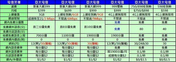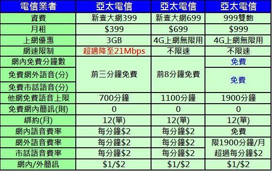 特別提醒,「4G 999 吃到飽」是短期的促銷且屬於獨立資費方案,無法要求由亞太現行資費變更為「4G 999 吃到飽」方案。