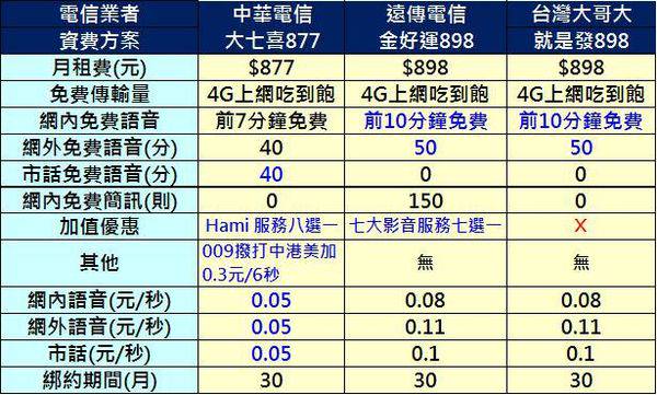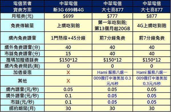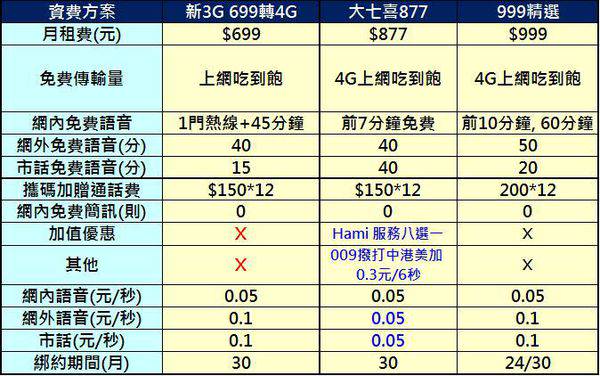 中華電信【3G 699轉4G吃到飽】、 【4G 大七喜877方案】或是【4G 999精選方案】的資費內容比較如下,因各資費的購機補貼不同,請依個人語音話務量需求大小及購機需求斟酌選辦。