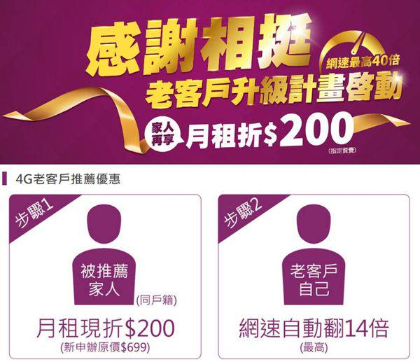 台灣之星【老客戶免費升級方案】就是家人中有人已經擁有台灣之星月租型門號且申辦滿一個月以上可以當作「 老客戶免費升級方案」的推薦人,"相同戶籍"的家人就可享月租折200元(499元月租享699吃到飽方案),推薦的老客戶若是388以上的月租型用戶則在8月15日起可享提高網速或是加贈通話金/降低語音通話費率等優惠。(資費內容及升級規範詳見官網)