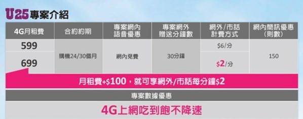 「4G 599 U25」限年滿12~25歲的年輕人才可以申辦,不但可享4G吃到飽而且有30分鐘網外分鐘數。月租+100元(699 U25),即可享打網外與市話每分鐘2元。若不符資格,就必須申辦4G 799/999或是4G 599單門號方案。