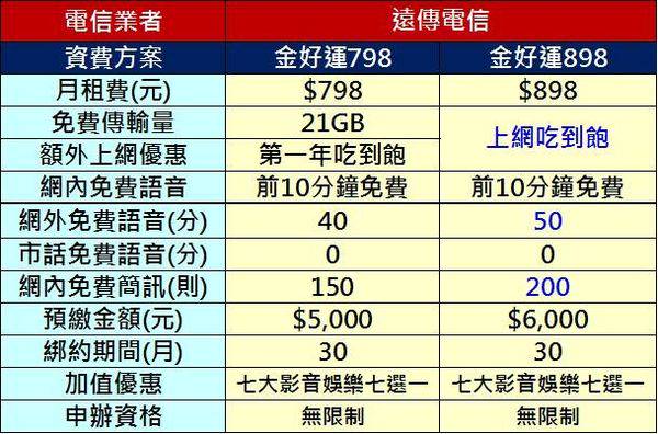 遠傳電信「金好運898方案」,月付898元,合約期間4G上網吃到飽、網內前10分鐘免費及200則免費網內簡訊、網外50分鐘語音免費,還可獲得七大影音娛樂服務七選一!與中華電信「大七喜 877吃到飽」及台灣大哥大「大七喜 899吃到飽」比較詳見這裡。