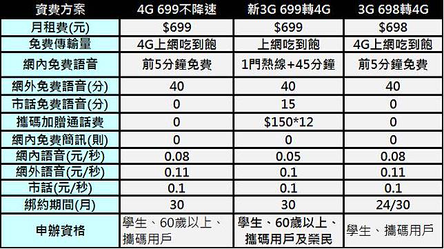 中華電信千元以下吃到飽方案【3G 699轉4G吃到飽】月繳699元,可升級4G上網吃到飽,網內免費語音有1門熱線與45分鐘免費網內語音分鐘數,網外/市話免費語音分鐘數為40分鐘與15分鐘。【3G 699轉4G吃到飽】的適用對象仍是限定學生、60歲以上、攜碼用戶及榮民,經銷特約通路只受理符合攜碼、學生、60歲以上用戶申辦。