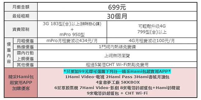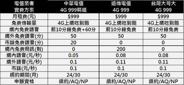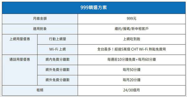 【999精選方案】,月繳999元即享4G行動上網吃到飽、網內通話前10分鐘免費講,每月再送60分鐘,網外跟市話分別送50分鐘及20分鐘免費,續約/新申租/攜碼皆可申辦,租期為24/30個月。