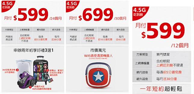 遠傳電信【網路門市】獨家推出「$599飆速吃到飽」單門號一年約/二年約方案,每月只要$599即享遠傳4.5G超級三頻上網飆速吃到飽,再享網內前五分鐘通話免費及網外30分鐘通話免費。 選擇二年約方案,加碼再送「海賊王28 吋行李箱、3M空氣清淨機、美國殺菌吸塵器好禮三選一」。另外,遠傳網路門市也有699吃到飽(綁約30個月)送萬元的WiFi雲端機器人!