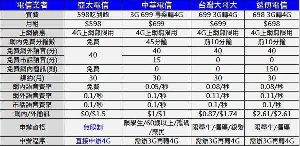 亞太電信「4G 598上網吃到飽」, 只要月付598元,不但享有4G上網吃到飽,網內語音與簡訊免費,網外語音/市話免費40分鐘且沒有資格限制,相當適合愛上網但少講電話的人。