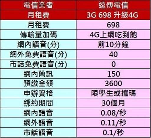 遠傳電信「3G 698轉4G吃到飽」方案限憑學生證或是攜碼用戶才可以申辦。申辦成功後,即可本人親到直營門市申辦無痛升級優惠(部分店家可以協助另外填寫3G升級4G申請書),升級成功即可月繳799享有4G 799資費的優惠內容及4G上網吃到飽。