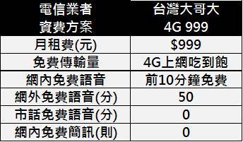 台灣大哥大「4G 999吃到飽方案」,月付999元,合約期間4G上網吃到飽、網內前10分鐘免費、網外50分鐘語音免費,與「就是發898方案」差別主要是手機購機補貼高!