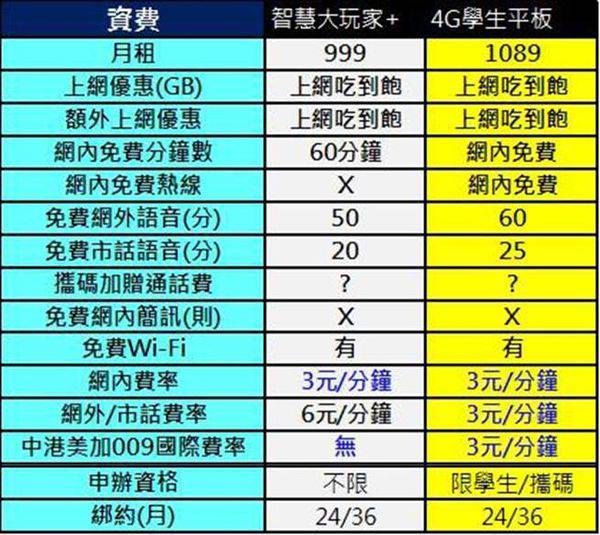 【中華電信智慧大玩家+999】,只要999元就可4G上網吃到飽,學生平板方案則是月繳1,089元就可網內語音免費(限中華窗口申辦)。申辦智慧大玩家+在中華電信營業窗口與特約門市只能搭購平板電腦,中華經銷通路則無限制。