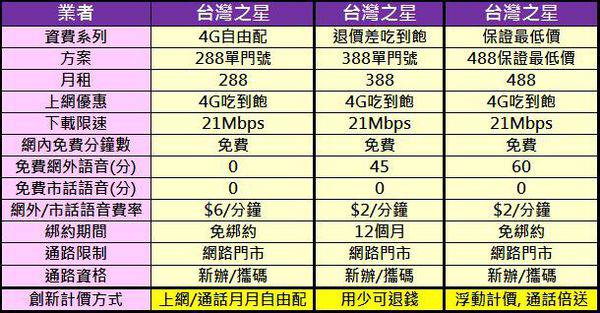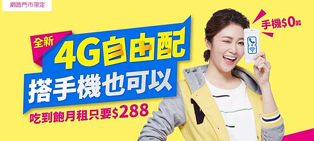 台灣之星網路門市八月中旬推出的「4G新自由配」創新資費,最低只要月繳288元,就能4G上網吃到飽,綁約24或30個月還可享購機補貼。「全新4G自由配」提供數百種資費自由組合彈性,可依照個人的上網與語音使用需求組合出最適合自己的方案,單辦門號案可以享月月可更換組合內容。「全新4G自由配」介紹詳見這裡。