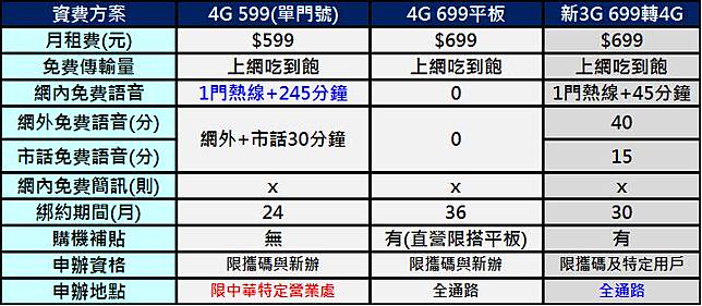 中華電信【4G 699平板方案】為平板購機方案,月繳699元可上網吃到飽但無任何通話優惠,購機補貼款較【3G 699轉4G吃到飽】高,適合搭購平板或是網卡使用。在中華直營與神腦特約門市申辦【4G 699平板方案】限搭平板,中華經銷特約則不限。