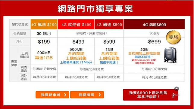 台灣大哥大網路門市獨家的「4G 599不降速單門號吃到飽(12)」及「4G 499降速21Mbps單門號吃到飽(12)」,限新辦或攜碼。本月新增699綁約30個月單門號案,加送行李箱。