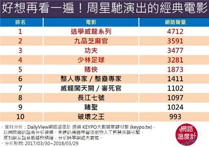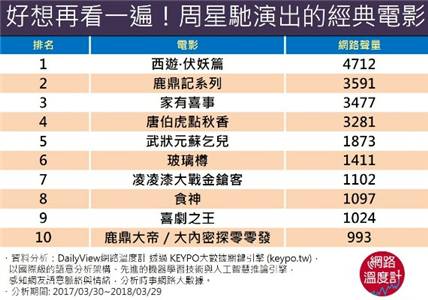 今日DailyView網路溫度計透過《KEYPO網路大數據》從2017年3月30日到2018年3月29日間觀察網友的討論串,星爺演出的電影作品不計其數,但是最受歡迎的是哪10部呢?